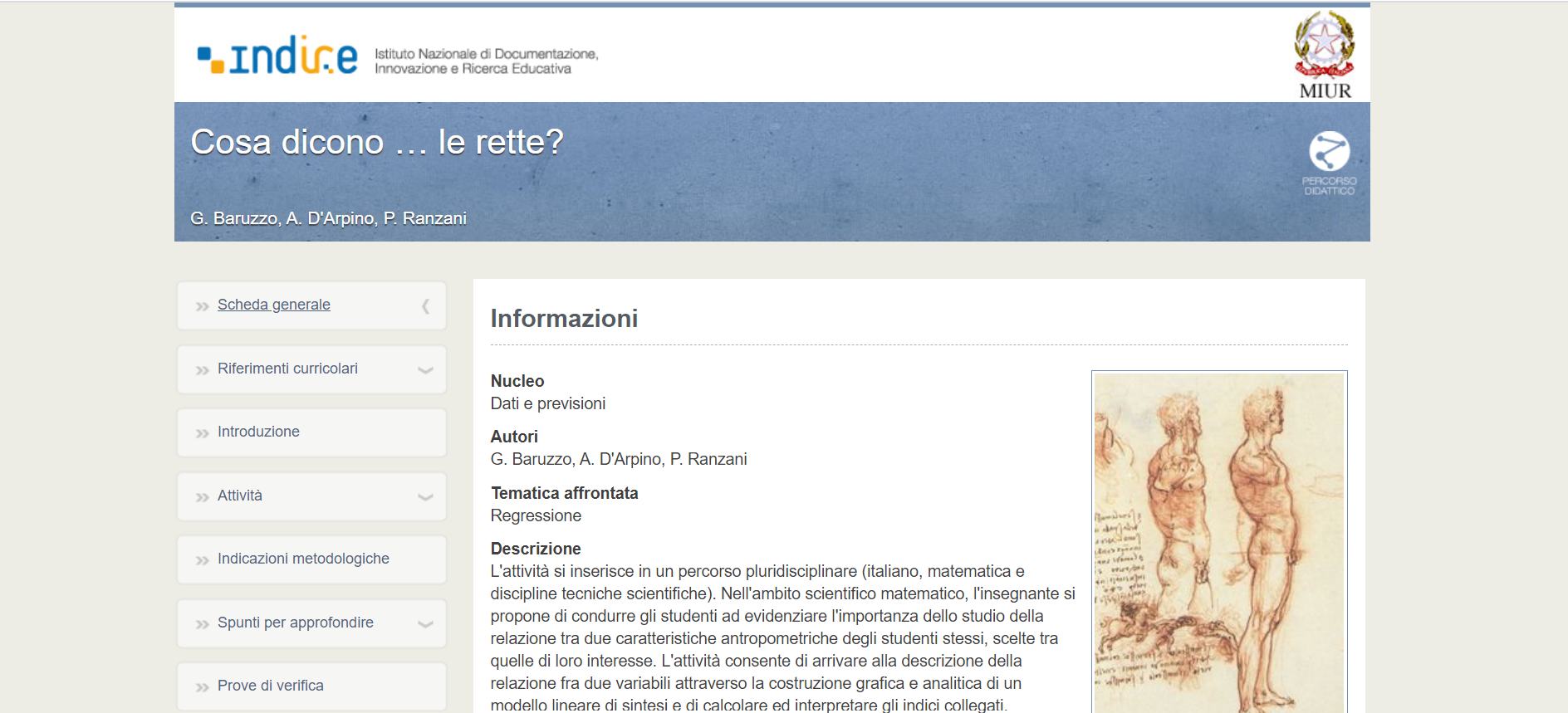 Nell’ambito scientifico matematico, l’insegnante si propone di condurre gli studenti ad evidenziare l’importanza dello studio della relazione tra due caratteristiche antropometriche degli studenti stessi, scelte tra quelle di loro interesse. L’attività consente di arrivare alla descrizione della relazione fra due variabili attraverso la costruzione grafica e analitica di un modello lineare di sintesi e di calcolare ed interpretare gli indici collegati.